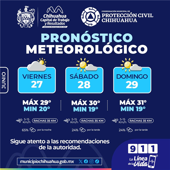 La Coordinación Municipal de Protección Civil informa que, para este fin de semana del 27 al 29 de junio, continuarán posibles lluvias en la capital, por lo que exhortan a seguir recomendaciones para cuidar la salud de las familias.