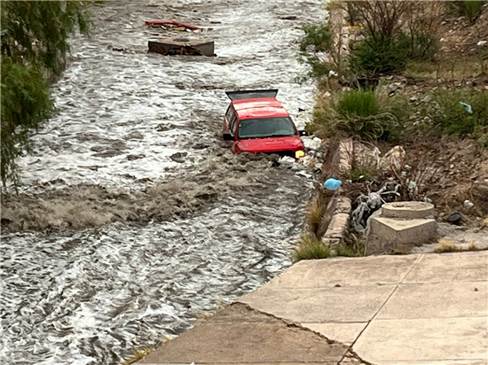 Un vehículo pick up de color rojo fue arrastrada parcialmente por la corriente al interior del cauce tras una creciente repentina. El conductor, un hombre de 55 años, ya se encontraba fuera del vehículo al momento de la atención. No se reportaron personas lesionadas.
