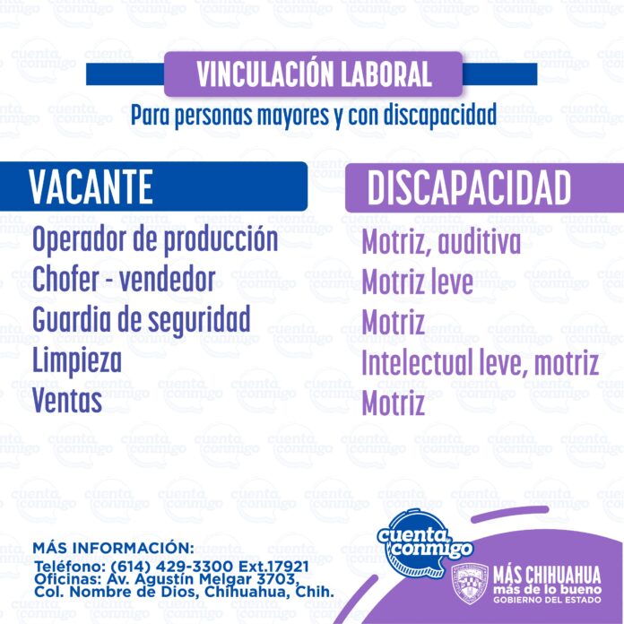 La Secretaría de Desarrollo Humano y Bien Común (SDHyBC), dio a conocer que el sector empresarial dispone de nuevas vacantes dirigidas a personas con alguna discapacidad, que residen en la ciudad de Chihuahua.