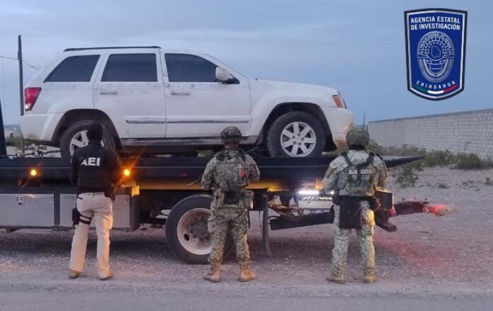 El informe policial refiere que se trata de un vehículo de la marca Jeep, línea Gran Cherokee, color blanco, modelo 2009 con placas de circulación del estado de Chihuahua, mismo que tiene un impacto de arma de fuego en el vidrio delantero.