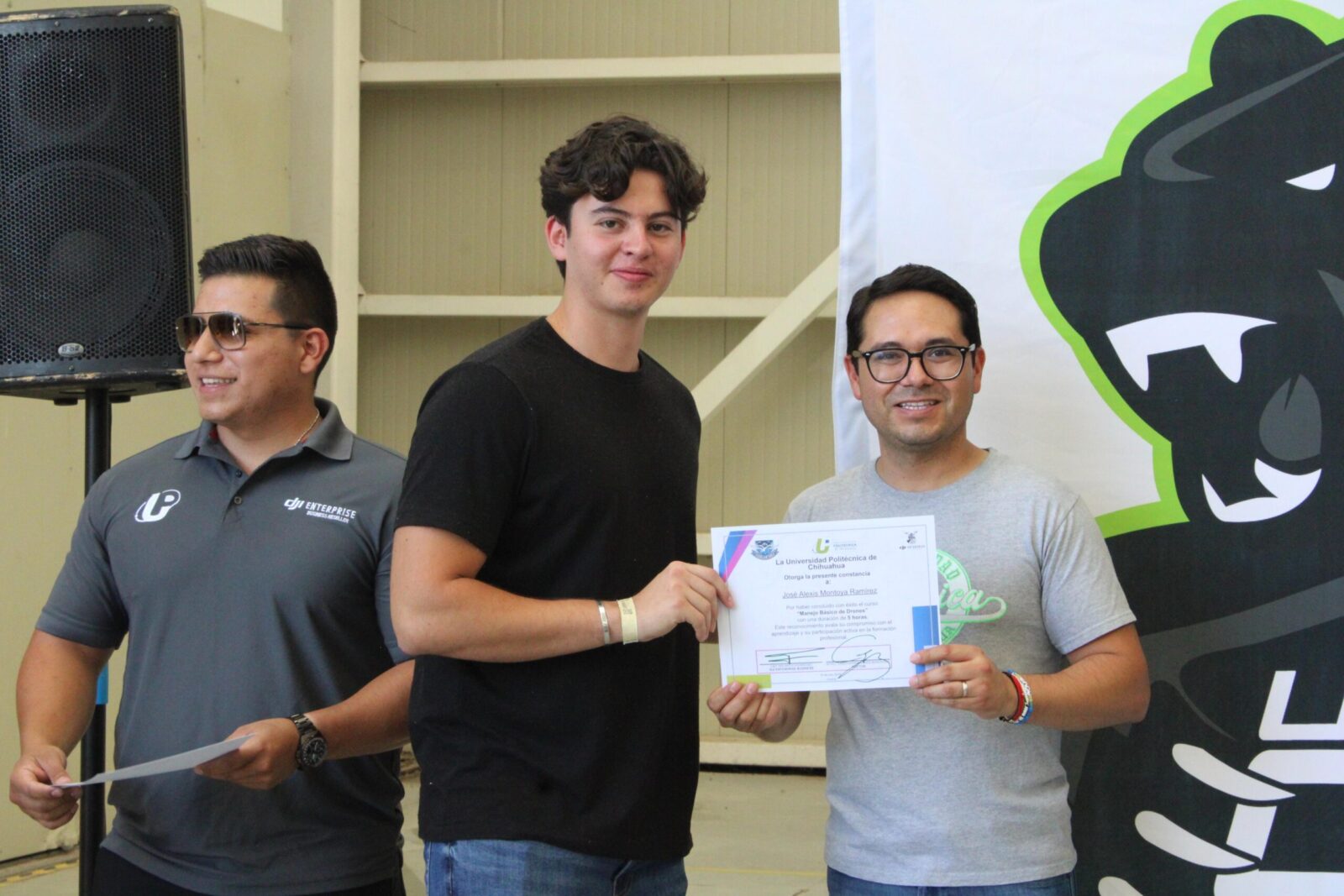 El rector Cristopher James Barousse junto con Carlos Mauricio Ferreiro López, socio fundador de la empresa y el representante de DJI Enterprise, Miguel Alberto Lozoya Romero, entregaron las constancias al personal docente y el alumnado.