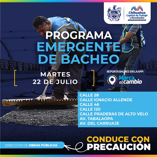 El Gobierno Municipal, a través de la Dirección de Obras Públicas, bacheará este 22 de julio mediante el programa emergente en las calles 28, Ignacio Allende, 46, 120 y Praderas de Alto Velo, así como en las avenidas Del Carruaje y Tabalaopa.