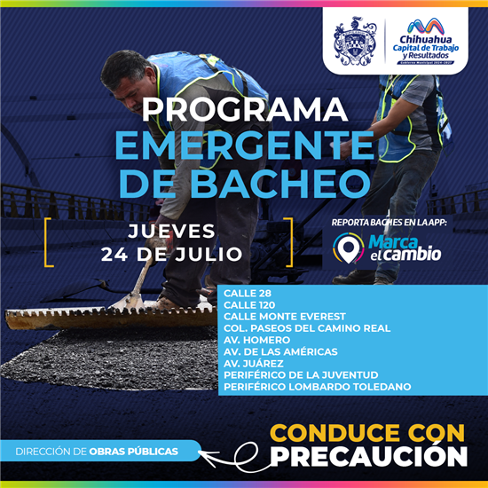 El Gobierno Municipal, a través de la Dirección de Obras Públicas, bacheará este 24 de julio mediante el programa emergente en las calles 28, 120, Monte Everest, en la colonia Paseos del Camino Real, así como en las avenidas Homero, De las Américas, Juárez y en los periféricos de la Juventud y Lombardo Toledano.