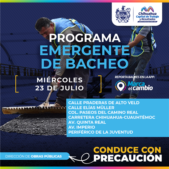 El Gobierno Municipal, través de la Dirección de Obras Públicas, realizará bacheo este 23 de julio mediante el programa emergente en las calles Praderas de Alto Veld, Elías Müller así como en la colonia Paseos del Camino Real, en las avenidas Quinta Real e Imperio, Periférico de la Juventud y en la carretera Chihuahua-Cuauhtémoc.