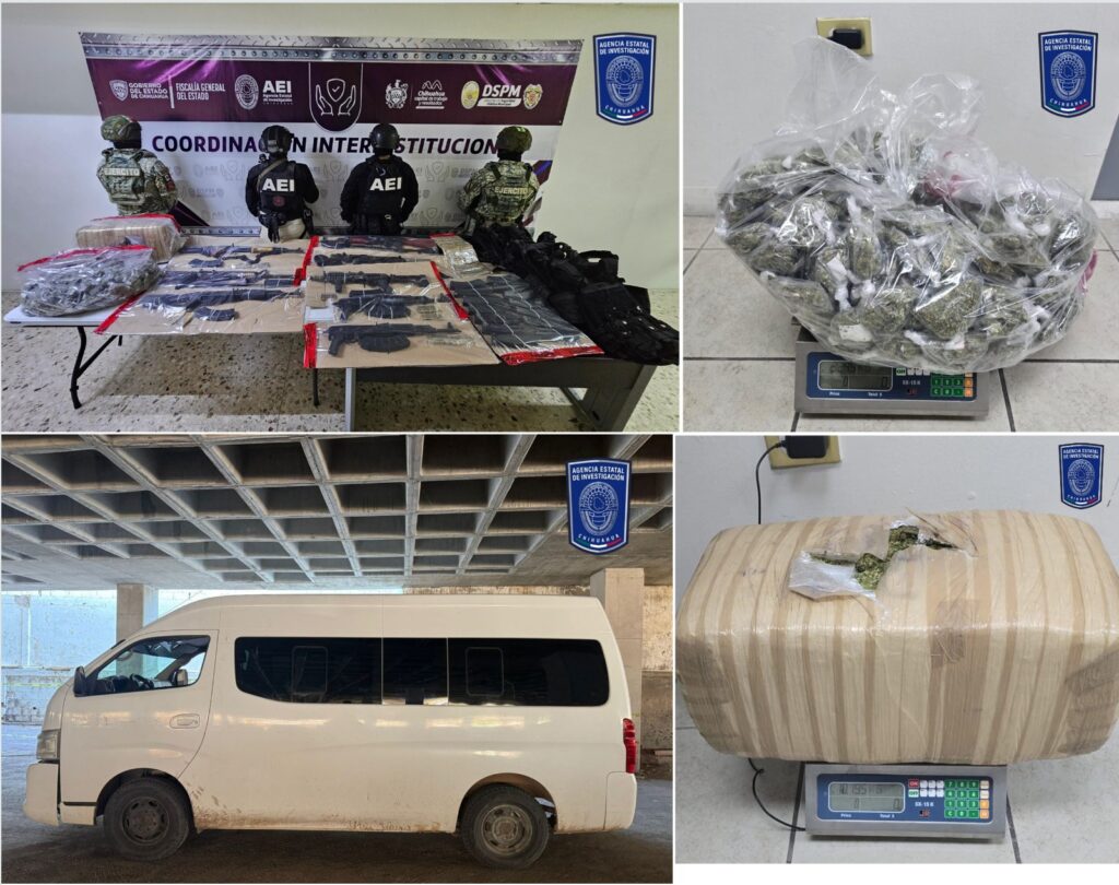 En el cruce de las calles Novena y Ojinaga, de la colonia San Jerónimo, fue asegurado para investigación, un vehículo tipo Van, marca Nissan, línea NV350, modelo 2017, color blanco, con matrícula del estado de Durango, en el cual, se localizaron: ocho armas de fuego tipo fusil (cinco del calibre 7.62×39 y tres del calibre .223); 22 cargadores (19 para cal. 7.62×39 y tres para.223 mm); 320 cartuchos útiles; 13.44 kilogramos de una hierba con las características de la mariguana y siete chalecos tácticos en color negro.