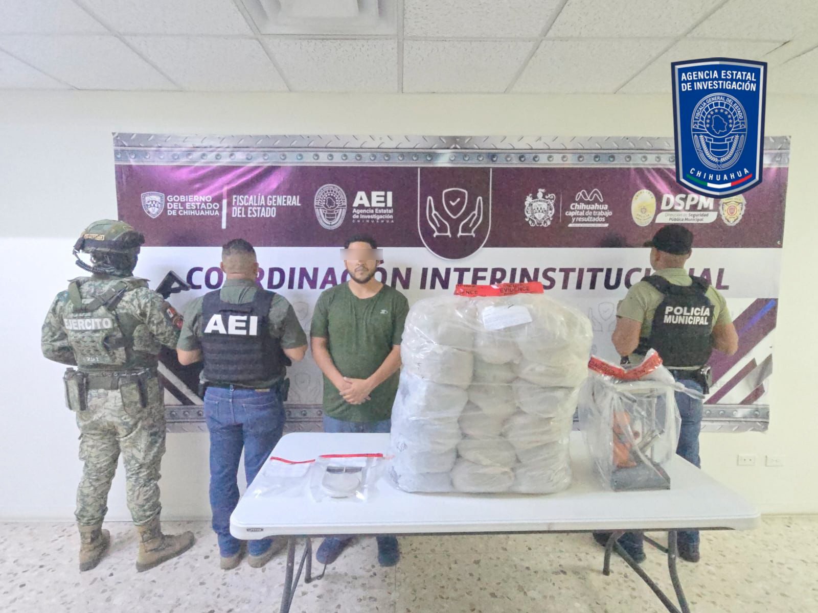 En el lugar, se reportó el arresto de una persona identificada como Luis Ángel L. V., quien fue sorprendido en posesión de 17.5 kilogramos marihuana y más de 22 gramos de metanfetamina, así como una báscula gramera, bolsas de plástico y una prensa utilizada para el empaquetamiento de dosis.