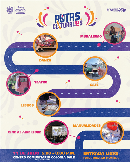 El Gobierno Municipal de Chihuahua, a través del Instituto de Cultura del Municipio, invita a disfrutar del próximo evento de Rutas Culturales, este 11 de julio de 5:00 a 8:00 pm en el centro comunitario de la colonia Dale en calle Trigésimo Sexta, número 3402.