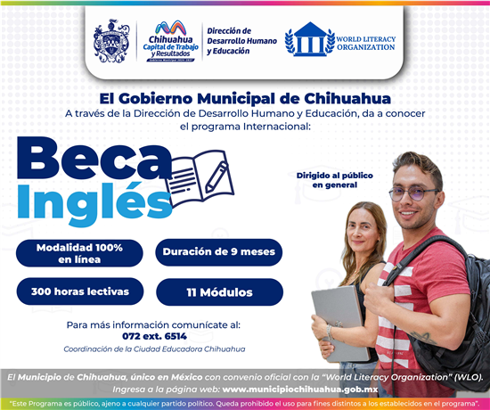 El Gobierno Municipal de Chihuahua, a través de la Dirección de Desarrollo Humano y Educación y la World Literacy Organization (WLO) da a conocer que ya está abierto el registro para inscribirse en el Curso de Inglés Nivel A1, dirigido a habitantes del municipio contando con el respaldo académico de la Universidad CEU Cardenal Herrera y avalado por la WLO.