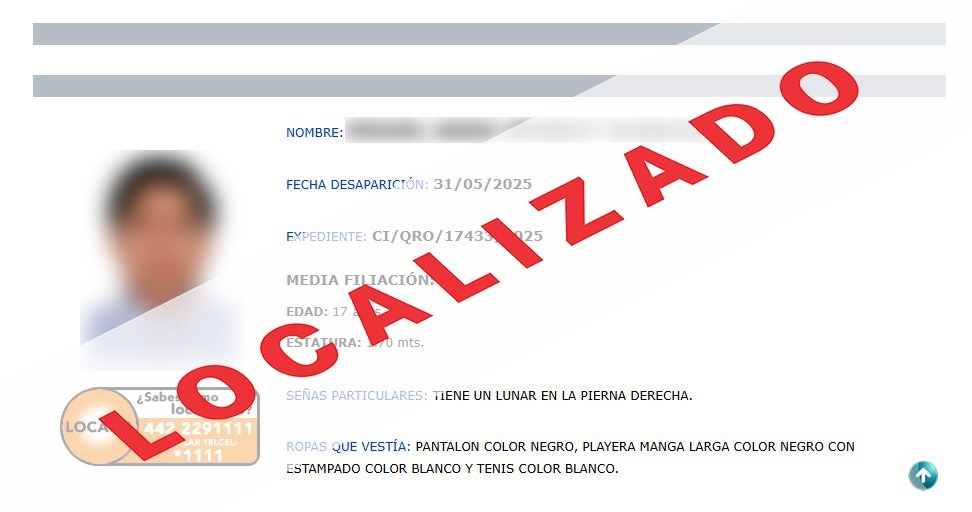 Como resultado de la colaboración entre autoridades, policías investigadores de la Unidad Especializada de Personas Ausentes y Extraviadas de la Fiscalía de Distrito Zona Centro, localizaron en perfecto estado de salud al adolescente de iniciales M. A. M. J., quien contaba con reporte de desaparición en el estado de Querétaro.