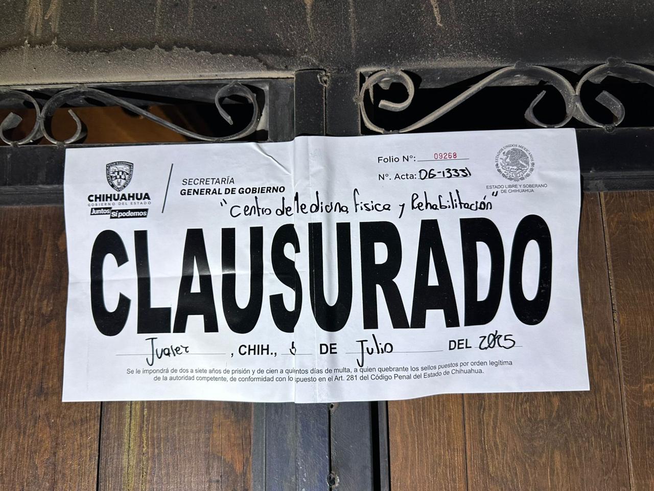 – Establecimiento “Centro de Medicina Física y Rehabilitación” por operar sin permiso