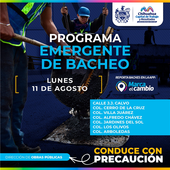 El Gobierno Municipal, a través de la Dirección de Obras Públicas realizará trabajos de bacheo mediante el programa emergente en la calle J.J. Calvo, así como en las colonias: Cerro de la Cruz, Villa Juárez, Alfredo Chávez, Jardines del Sol, Los Olivos y Arboledas.