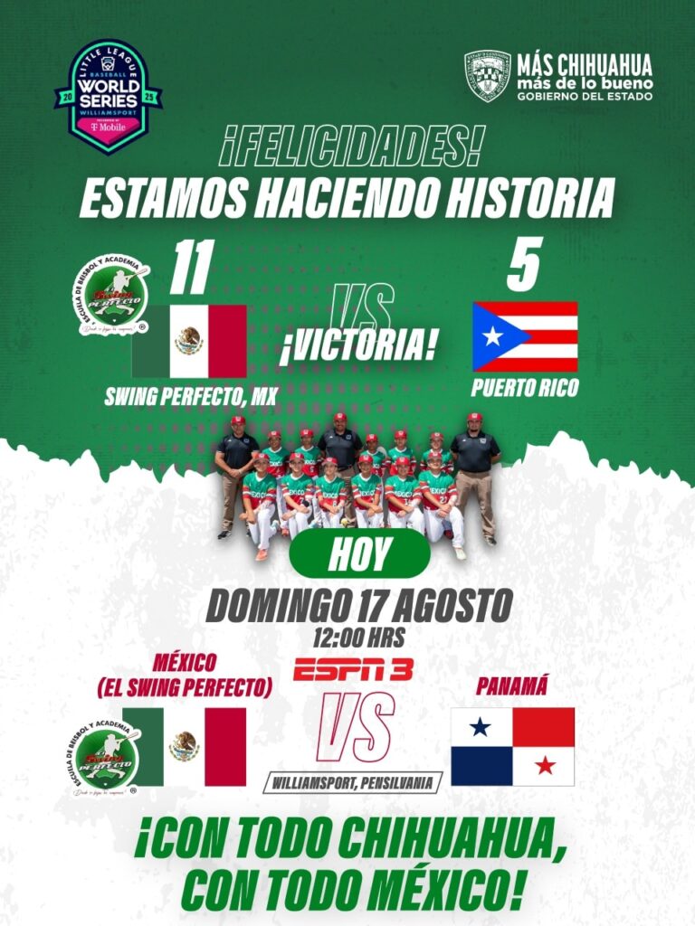 Deportes Chihuahua sigue haciendo historia en la Serie Mundial de Pequeñas Ligas. Por Redacción - agosto 17, 2025 0 263 FacebookXPinterestWhatsApp Nuestro representativo nacional logró una épica remontada, tras ir abajo 4-0 hasta la quinta entrada, para vencer 11-5 a Puerto Rico en Williamsport, Pensilvania. Un triunfo que refleja disciplina, esfuerzo y dedicación.
