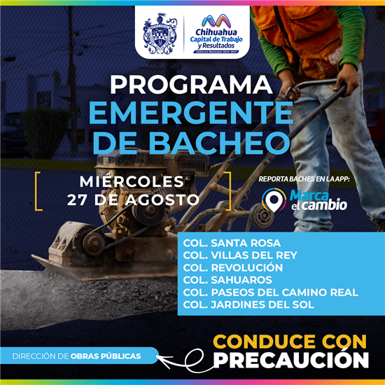 El Gobierno Municipal, a través de la Dirección de Obras Públicas, atenderá baches este 27 de agosto con el programa emergente en las colonias Santa Rosa, Villas del Rey, Revolución, Sahuaros, Paseos del Camino Real y Jardines del Sol.