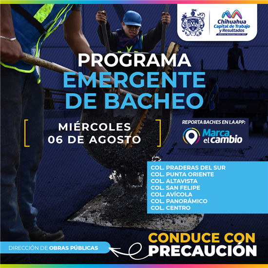 El Gobierno Municipal, a través de la Dirección de Obras Públicas, realizará trabajos de bacheo mediante el Programa Emergente en las colonias: Praderas del Sur, Punta Oriente, Altavista, San Felipe, Avícola, Panorámico y Zona Centro.