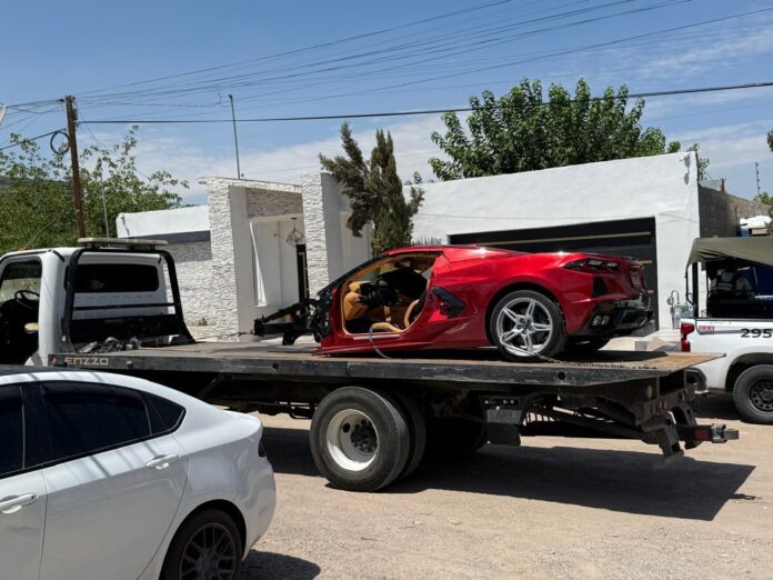 En el lugar fue hallado un automóvil semidesmantelado de marca Chevrolet, línea Corvette, de color rojo, y en la revisión a cargo de Peritos de la Dirección de Servicios Periciales, analizaron las pruebas recabadas y confirmaron que tiene reporte de robo interpuesto el pasado martes 29 de julio en Arizona.