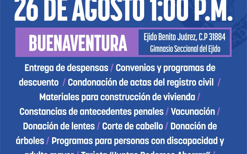 El Gobierno del Estado, a través de la Secretaría de Desarrollo Humano y Bien Común (SDHyBC), llevará este martes 26 de agosto, la feria de servicios gratuitos “Cuenta Conmigo” a las familias del Ejido Benito Juárez, municipio de Buenaventura.
