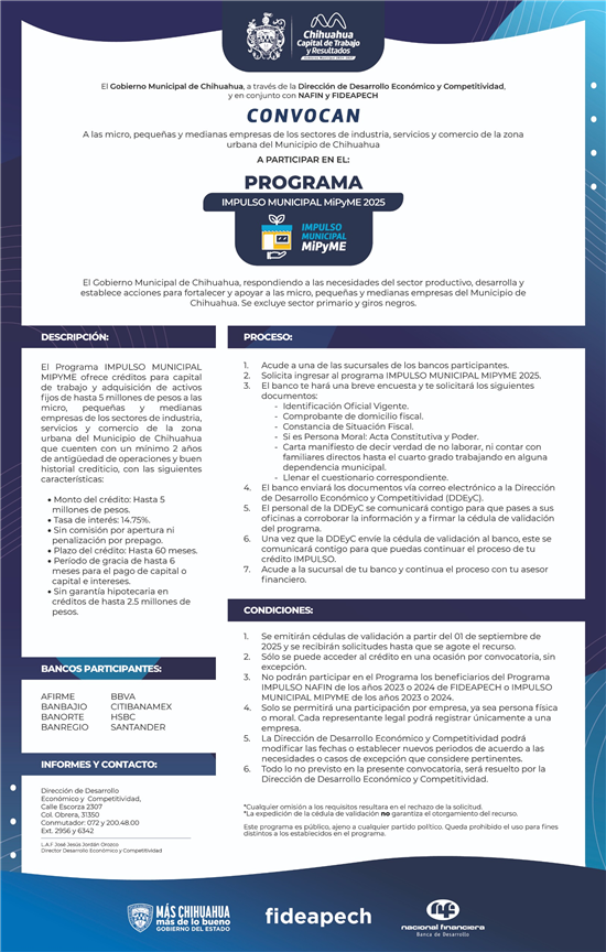 El Gobierno Municipal de Chihuahua, a través de la Dirección de Desarrollo Económico y Competitividad, en conjunto con NAFIN y FIDEAPECH, invita a los negocios de los sectores de industria, servicios y comercio a participar en el programa “Impulso Municipal MIPYME 2025”, convocatoria que puedes encontrar en la siguiente liga: https://www.municipiochihuahua.gob.mx/CCS/Convocatorias.