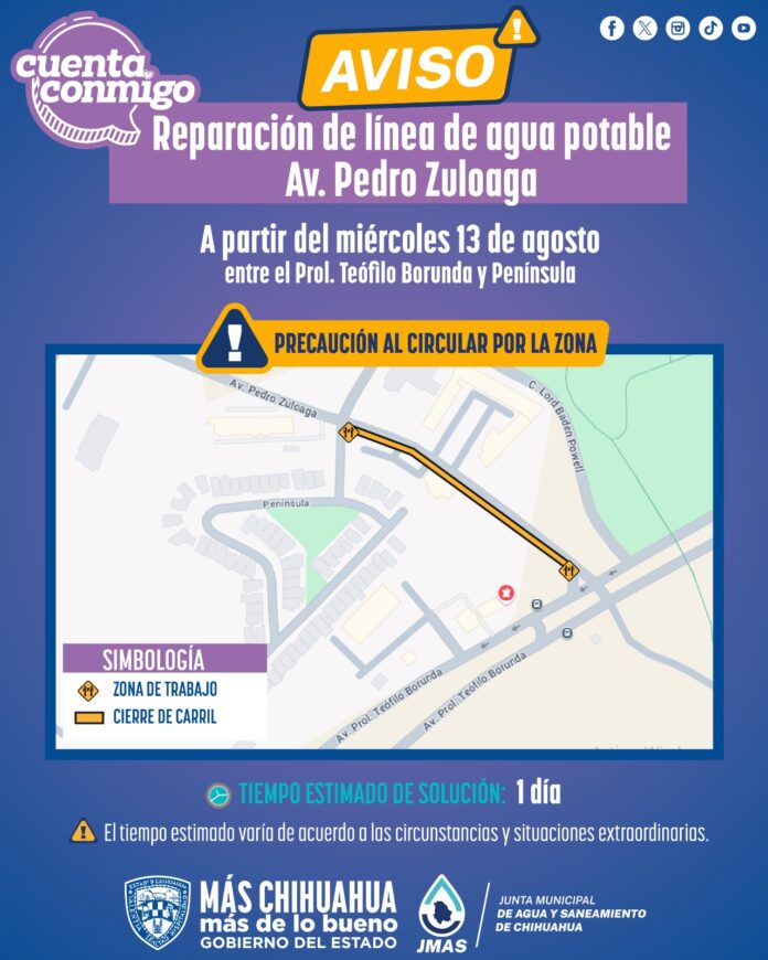 Personal de la Junta Municipal de Agua y Saneamiento (JMAS) de Chihuahua, iniciará este miércoles los trabajos para reparar la línea general de agua potable ubicada en la avenida Pedro Zuloaga.