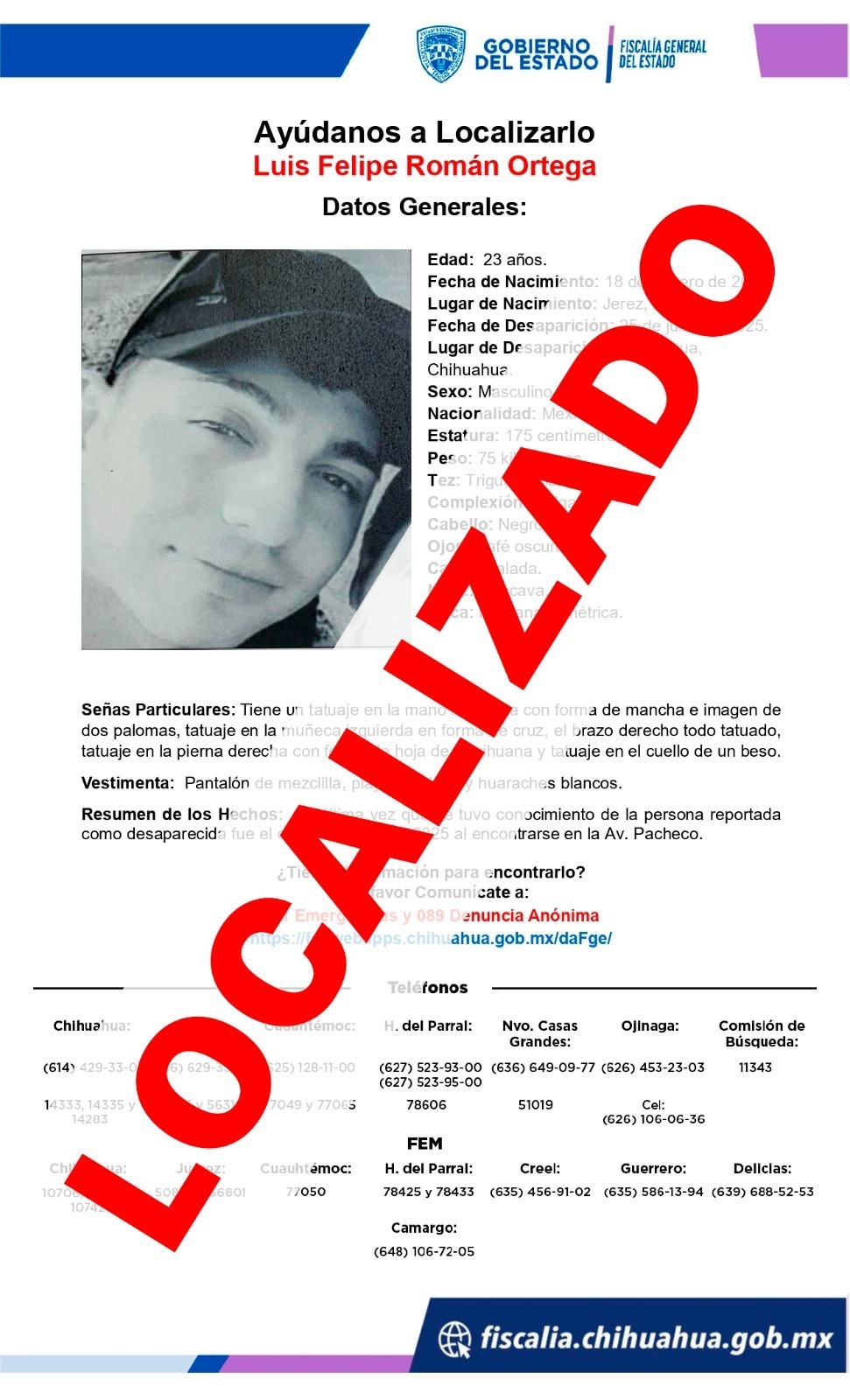 La Unidad de Investigación de Personas Ausentes y/o No Localizadas de la Fiscalía de Distrito Zona Centro (FDZC) localizó sano y salvo Luis Felipe R. O., de 23 años, quien contaba con reporte de ausencia interpuesto en la ciudad de Chihuahua.