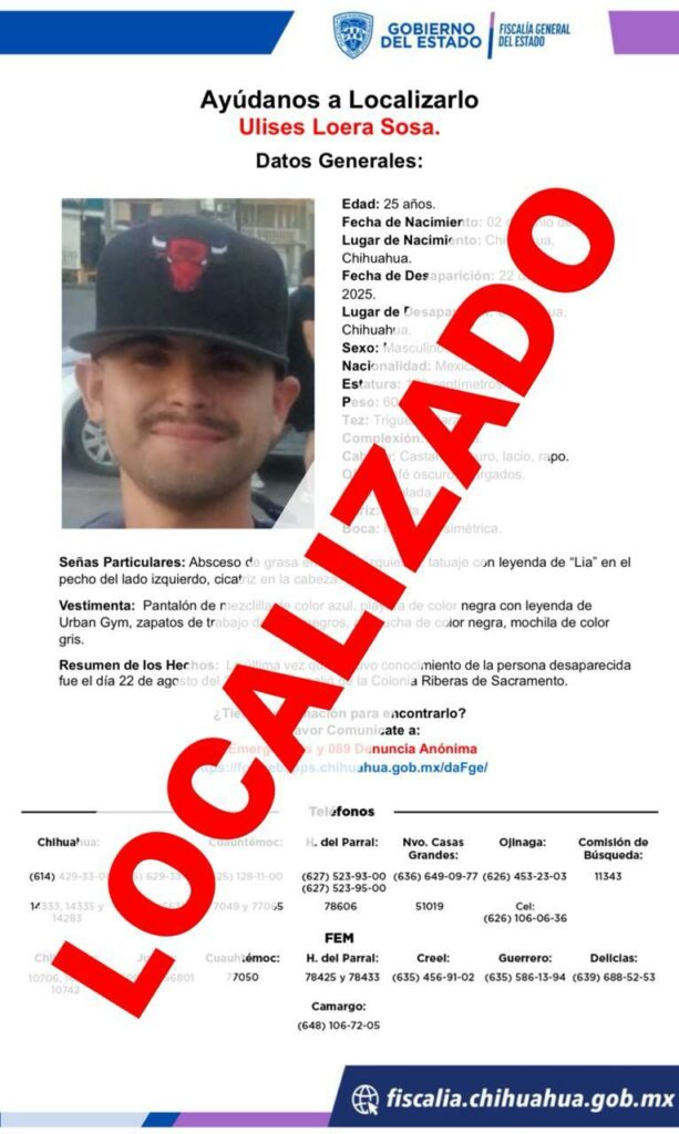 La Unidad de Investigación de Personas Ausentes y/o No Localizadas de la Fiscalía de Distrito Zona Centro (FDZC) localizó sano y salvo a Ulises L.S., persona de 25 años de edad que contaba con reporte de ausencia interpuesto en la ciudad de Chihuahua.