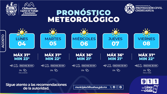 El Gobierno Municipal de Chihuahua, a través de la Coordinación Municipal de Protección Civil, informa que durante esta semana se mantendrán condiciones variables en el clima, con cielos soleados, tardes calurosas y mínimas probabilidades de lluvia.