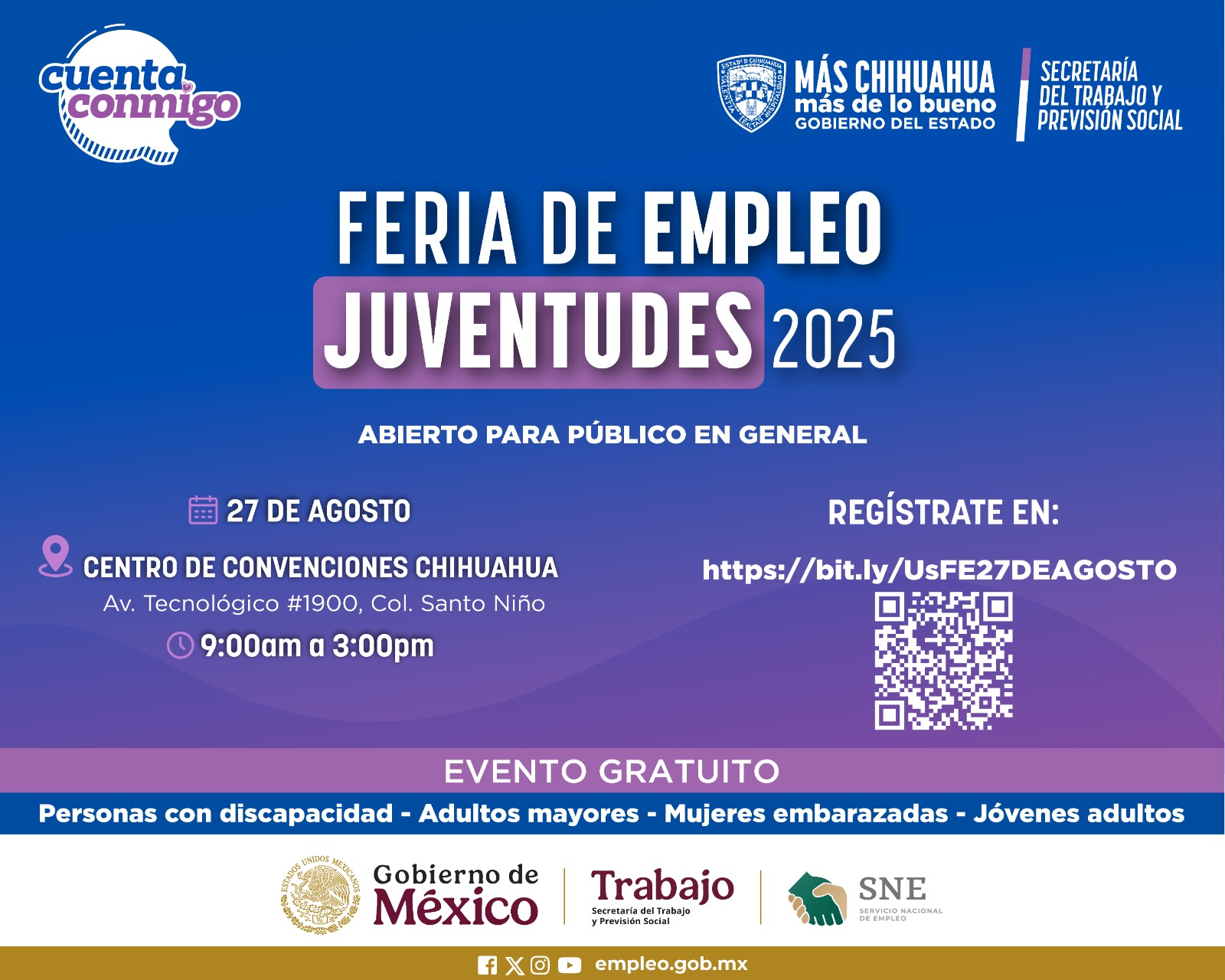 El Gobierno del Estado, a través de la Secretaría del Trabajo y Previsión Social (STPS) y del Servicio Estatal de Empleo (SEE), invita a asistir a la Feria de Empleo de las juventudes, en donde se ofertarán 3 mil 500 vacantes, de las cuales 1,300 son incluyentes.