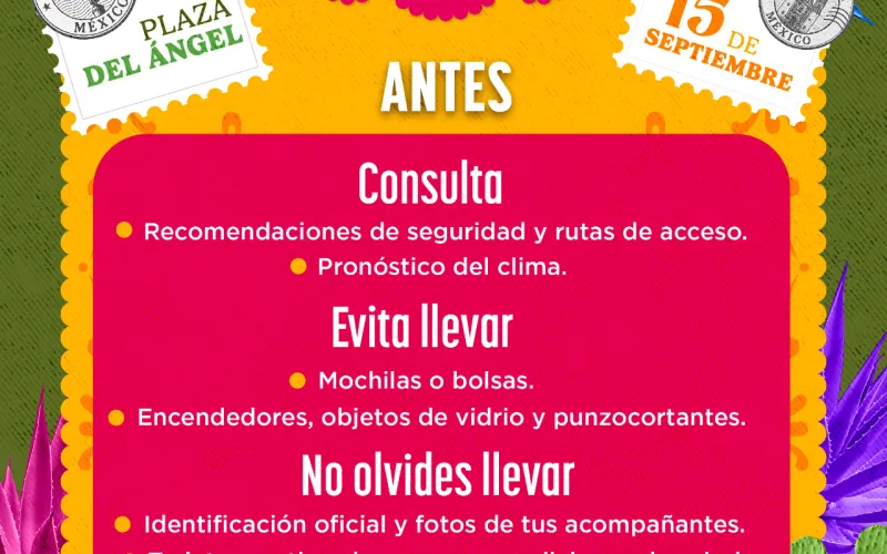 Además, se solicita evitar traer sombrillas puntiagudas, mochilas voluminosas, objetos punzocortantes, encendedores, cerillos o cualquier artículo que represente un riesgo, así como mantener cargado el teléfono celular y establecer un punto de reunión con familiares o amigos en caso de separación.