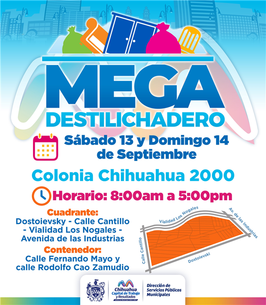 Con el objetivo de evitar acumulación de tiliches en la vía pública, así como en las viviendas, el Gobierno Municipal, a través de la Dirección de Servicios Públicos Municipales, realizará un Mega Destilichadero a la colonia Chihuahua 2000 los días sábado 13 y domingo 14 de septiembre en un horario de 8:00 am a 5:00 pm.