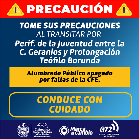 El Gobierno Municipal, a través de la Dirección de Mantenimiento Urbano, informa que debido a falta de atención por parte de la Comisión Federal de Electricidad (CFE), se están presentando afectaciones en el sistema de alumbrado público que se encuentra en la lateral del Periférico de la Juventud, esto desde la Prolongación Teófilo Borunda y hasta la calle Geranios.