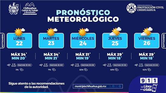A través de la Coordinación de Protección Civil, informa las condiciones climatológicas que se esperan para esta semana en la capital del estado, de acuerdo con datos del Sistema Meteorológico Nacional.