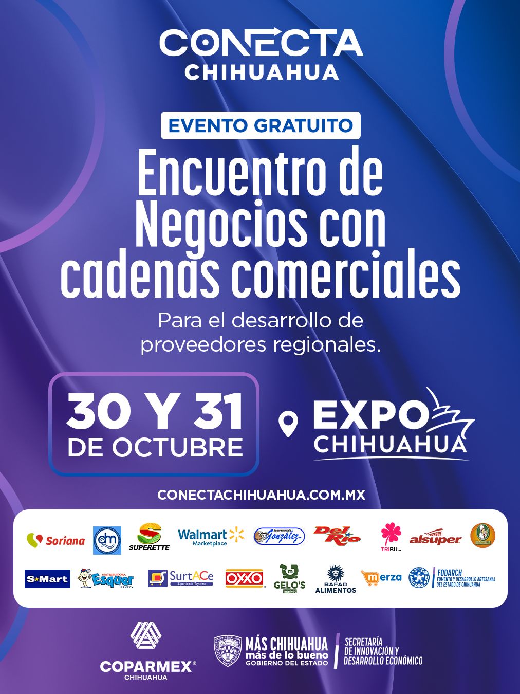 El Gobierno del Estado, a través de la Secretaría de Innovación y Desarrollo Económico (SIDE), en coordinación con la Confederación Patronal de la República Mexicana (Coparmex) invita a empresas locales a participar en el encuentro de negocios “Conecta Chihuahua 2025”.