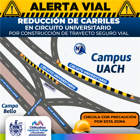 A través de la Dirección de Obras Públicas, emite una alerta vial por la reducción de carriles en el Circuito Universitario a la altura de la Facultad de Ingeniera de la UACH, en el sentido sur-norte debido a los trabajos de demolición de asfalto para la construcción de un paso peatonal pompeyano, como parte de la obra denominada Trayecto Vial Seguro.