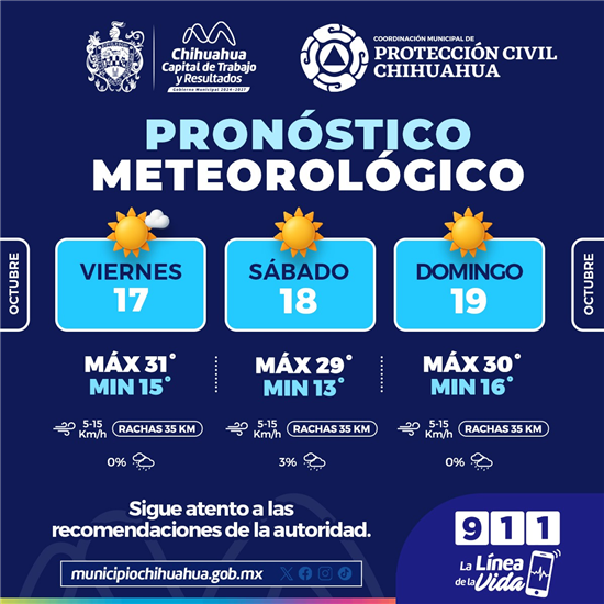 A través de la Coordinación Municipal de Protección Civil, informa que, para este fin de semana, del 17 al 19 de octubre, se esperan días cálidos y soleados, con temperaturas máximas de 31°C.