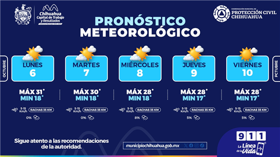 A través de la Coordinación Municipal de Protección Civil, informa el pronóstico del clima para esta semana, de acuerdo con datos del Servicio Meteorológico Nacional, el cual indica condiciones mayormente estables, cielos parcialmente nublados y sin probabilidad significativa de lluvia.
