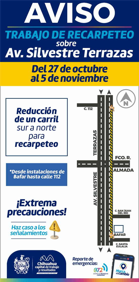 El Gobierno Municipal, a través del Consejo de Urbanización Municipal (CUM), emite una alerta vial por los próximos trabajos de recarpeteo en el tramo de la carretera a Cuauhtémoc-Silvestre Terrazas que iniciarán desde la calle Santa Eulalia hasta la calle 112ª en sentido de sur a norte por lo que se exhorta a la ciudadanía a circular con precaución por la zona.