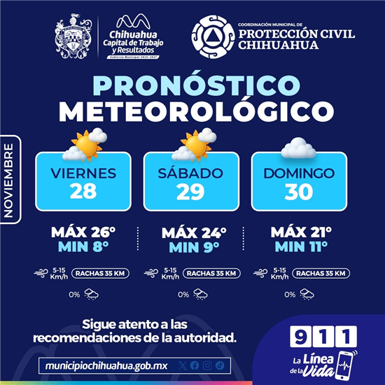 A través de la Coordinación Municipal de Protección Civil, informa las condiciones climáticas previstas para este fin de semana en la capital.
