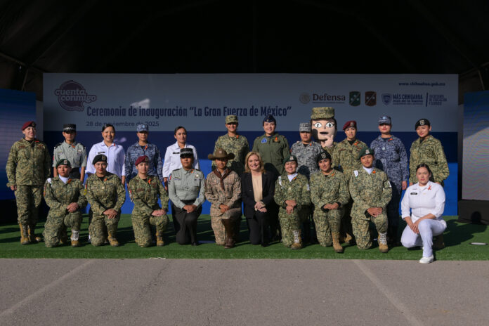 La gobernadora Maru Campos acudió como invitada de honor a la ceremonia de inauguración de la exposición militar “La Gran Fuerza de México”, en la que la Secretaría de la Defensa Nacional (Sedena) muestra a la ciudadanía parte de su equipo y esquema de trabajo.