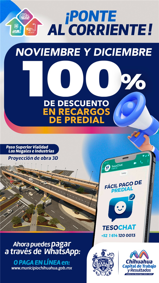 El Gobierno Municipal, a través de Tesorería, informa que ahora podrás pagar tu predial de una manera más fácil, solo tienes que ingresar a tu WhatsApp y por medio del TesoChat te atenderán en el número 614 120 0013, para que aproveches y pagues tu Predial con el descuento del 100% en noviembre y diciembre.