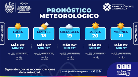 De acuerdo con el Servicio Meteorológico Nacional este lunes 17 de noviembre se prevé un día soleado, con una máxima de 28°C y mínima de 13°C; asimismo, para este martes 18, prevén cielos parcialmente nublados, con máximas de 26°C, mínimas de 12°C y sin probabilidad de lluvias.