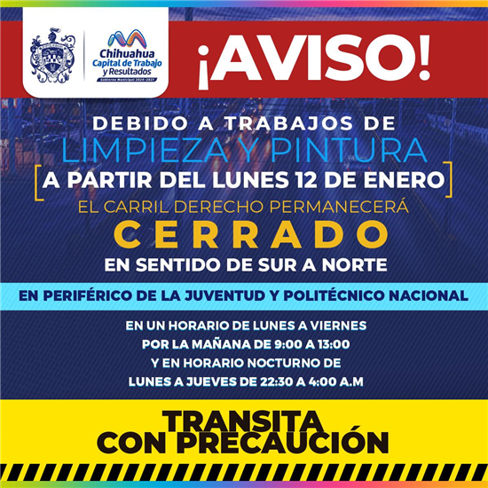 El Gobierno Municipal de Chihuahua, a través de la Dirección de Mantenimiento Urbano, realizará limpieza y pintura en el bajo puente ubicado en el cruce del Periférico de la Juventud y la avenida Politécnico Nacional, labores que comprenderán a partir de la noche del lunes 12 de enero, hasta el viernes 6 de febrero, por lo que exhortan a circular con precaución ya que se cerrará un carril.