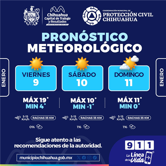 La Coordinación Municipal de Protección Civil alerta que, para este fin de semana, del 9 al 11 de enero, se pronostican mínimas bajo cero por las madrugadas y fresco durante el día, por lo que exhortan a no bajar la guarida y seguir las recomendaciones para evitar enfermedades respiratorias.