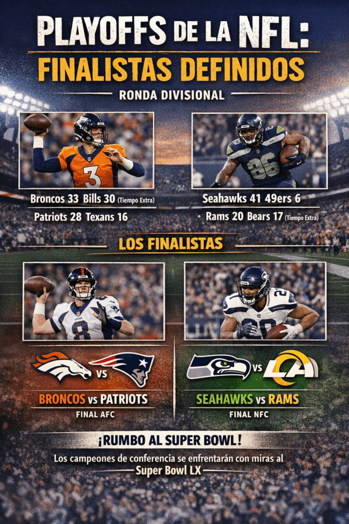 Con estos resultados, las finales de conferencia quedaron definidas con los enfrentamientos entre Broncos y Patriots en la AFC, y Seahawks frente a Rams en la NFC, partidos que se disputarán el próximo fin de semana para definir a los equipos que buscarán el título en el Super Bowl.