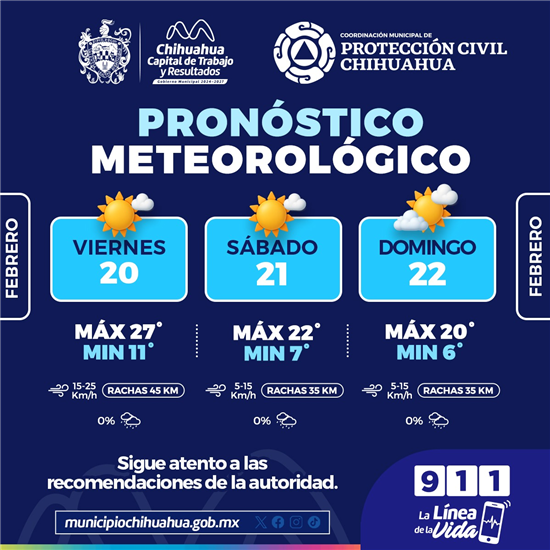 Asimismo, para este sábado se pronostica una máxima de 22°C y mínima de 7°C, con condiciones también mayormente soleadas; y para el domingo se anticipa una temperatura máxima de 20°C y mínima de 6°C, con cielo parcialmente nublado. Para ambos días se esperan rachas de viento de hasta 35 kilómetros por hora.