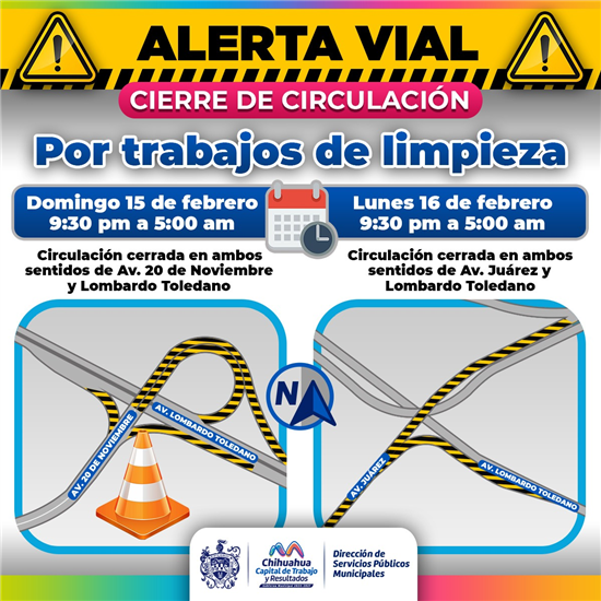 Por lo anterior, se hace un exhorto a la ciudadanía a tomar las precauciones debidas ya que el domingo 15 de febrero permanecerá cerrada la circulación en ambos sentidos del distribuidor vial de la avenida 20 de noviembre y Lombardo Toledano en un horario de 9:30 pm a 5:00 am.