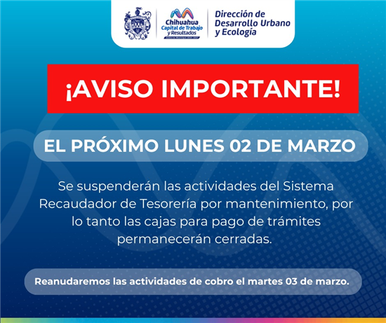 El Gobierno Municipal de Chihuahua, informa a la ciudadanía que el próximo lunes 2 de marzo el sistema recaudador permanecerá fuera de servicio debido a trabajos de mantenimiento programado, por lo que no podrán realizarse pagos en áreas de la Dirección de Desarrollo Urbano y Ecología, así como otros servicios que requieran el uso de dicho sistema.