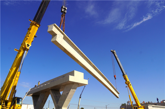 Mediante el uso de maquinaria pesada especializada y con el apoyo de personal técnico, se lleva a cabo la colocación de 12 trabes más de concreto reforzado, elementos estructurales horizontales fundamentales en la construcción de puentes. Su función es soportar el peso de la superficie por donde circulan los vehículos y distribuir esa carga hacia las columnas o soportes, permitiendo que la estructura sea segura y estable.