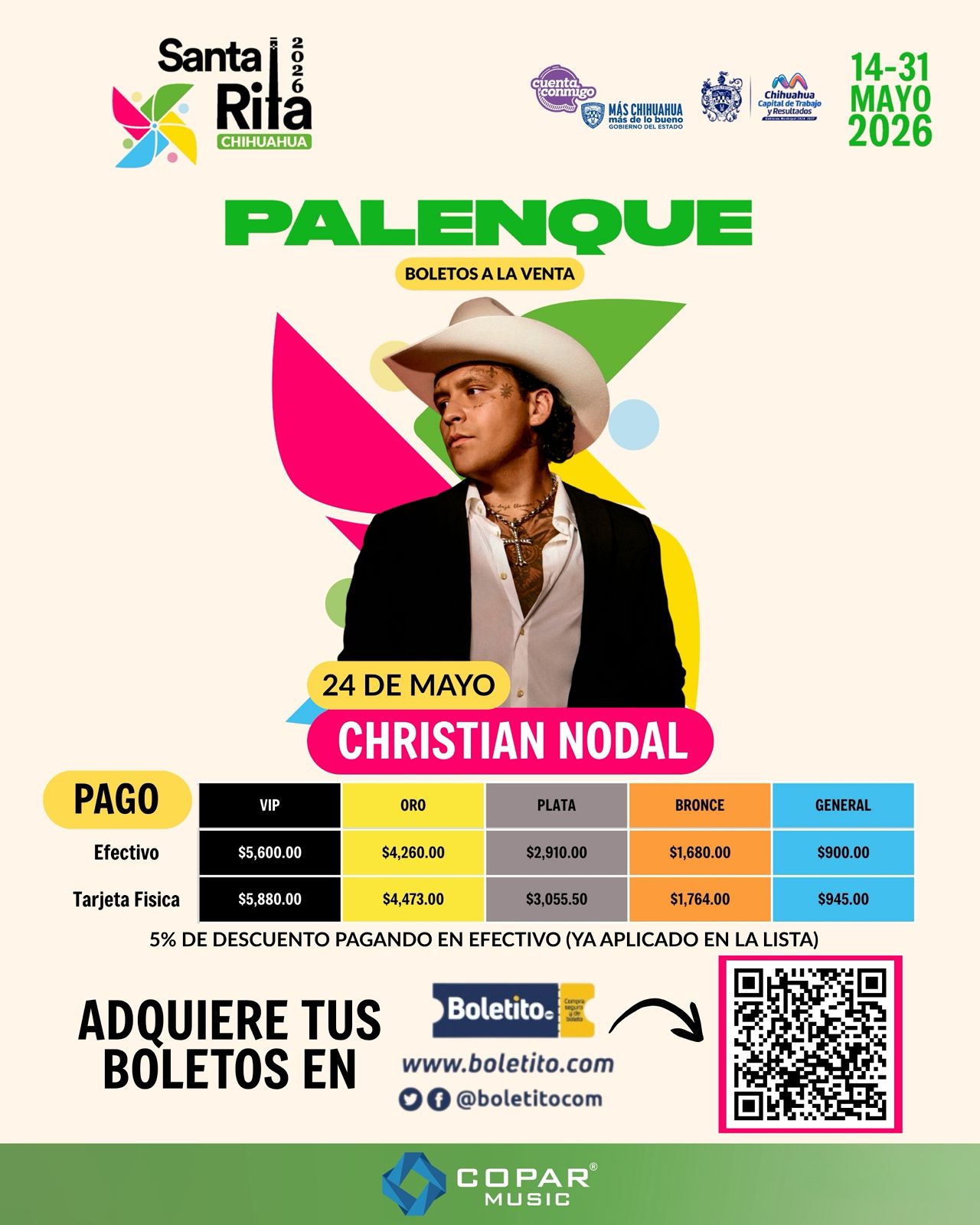 La Feria de Santa Rita 2026 continúa revelando a los artistas que formarán parte de su tradicional palenque, destacando la participación del cantante de regional mexicano Christian Nodal, quien se presentará el próximo 24 de mayo.