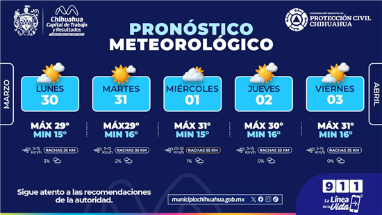 A través de la Coordinación Municipal de Protección Civil, informa el pronóstico del clima para Semana Santa, del 30 de marzo al 3 de abril, con el objetivo de que la ciudadanía tome precauciones y planifique sus actividades.