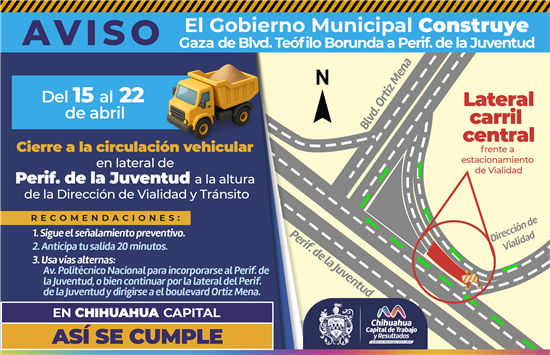 A través de la Dirección de Obras Públicas, emite una alerta vial por el cierre temporal a la circulación en la lateral del periférico de la Juventud, a la altura de las oficinas de la Dirección de Vialidad y Tránsito, debido a trabajos de modernización de la línea de agua potable, como parte de la construcción de la Gaza de Incorporación.